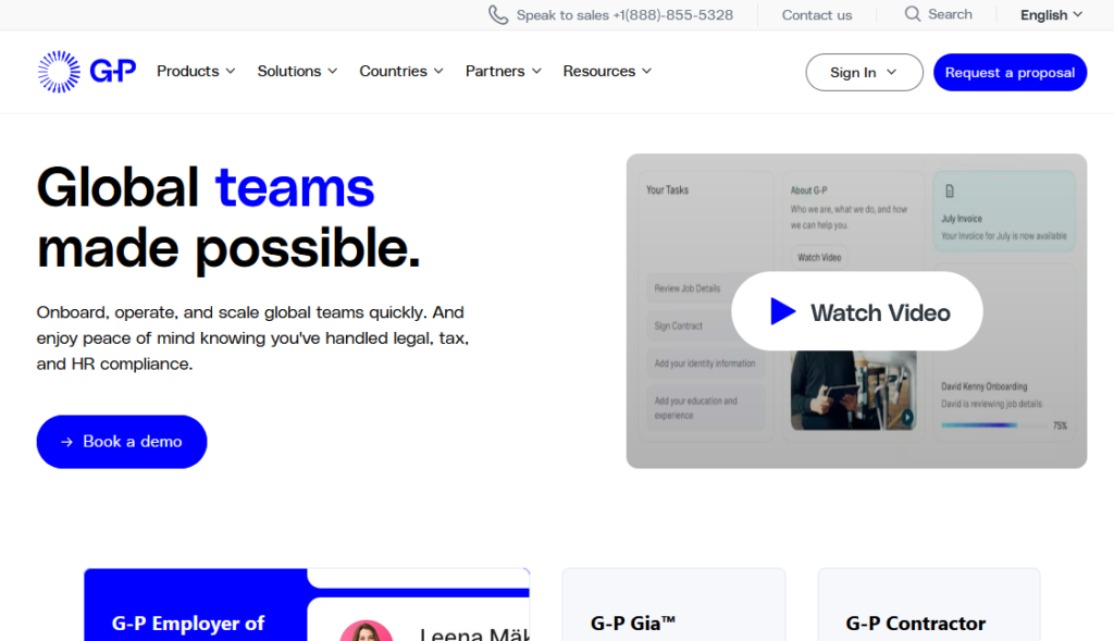 As one of the originators of the EOR category, G-P was founded in 2012 by Nicole Sahin with a mission to simplify HR processes and promote productivity across global teams. That heritage translates into genuine institutional depth. Their G-P Meridian Suite offers a customisable range of global employment products covering the full HR lifecycle, and G-P Gia, positioned as the first AI-based HR compliance adviser, provides data-driven recommendations on top of the core platform.